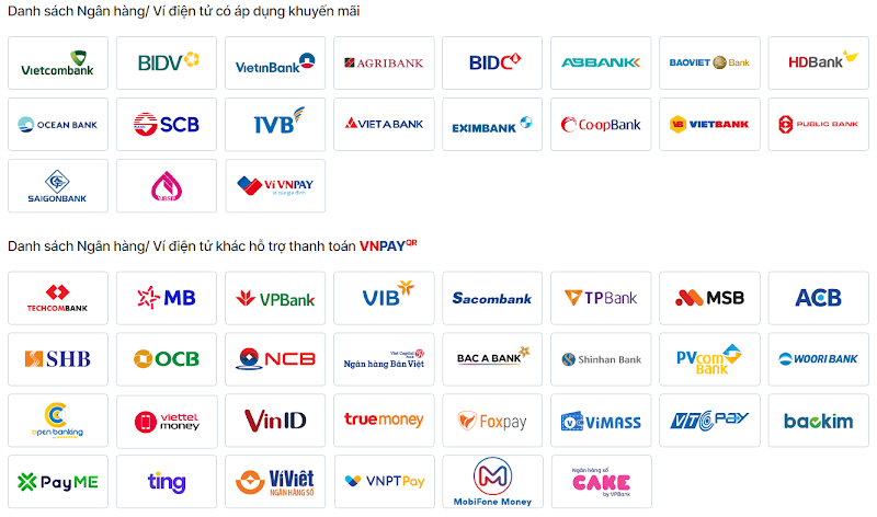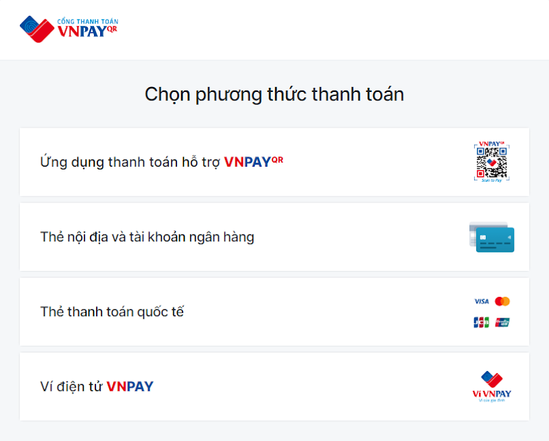 Cổng thanh toán VNPAY là giải pháp thanh toán do Công ty Cổ phần Giải pháp Thanh toán Việt Nam (VNPAY) phát triển. Khách hàng sử dụng thẻ/tài khoản ngân hàng, tính năng QR Pay/VNPAY-QR được tích hợp sẵn trên ứng dụng Mobile Banking của các ngân hàng hoặc Ví điện tử liên kết để thanh toán các giao dịch và nhập mã giảm giá (nếu có)